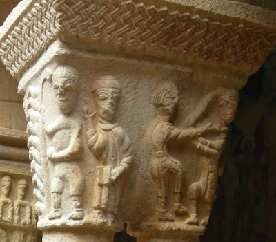 Y entre los dos capiteles anteriores, se encuentra un tercero que esta bordeado con un buen número de personajes representantes de los diferentes estatus eclesiásticos...,